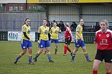 Eastbourne Town Women players in yellow in a local derby match with Eastbourne Borough women in February 2023