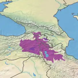The ecoregion occupies the Armenian Highlands, a plateau lying mostly between 1500 and 2500 meters elevation. The volcanic peaks Mount Ararat (5137 m) and Mount Süphan (4058 m) rise above the plateau.[1] It covers portions of eastern Turkey, eastern and southern Armenia, Azerbaijan's Nakhchivan Autonomous Republic, the Javakheti region of southern Georgia, and northwestern Iran. The highlands are bounded on the northeast by the Lesser Caucasus, on the northwest by the Pontic Mountains, and on the south by the Zagros Mountains. To the east the plateau descends towards the Aras-Kura lowlands, and in the Aras valley the ecoregion descends to 375 meters elevation.