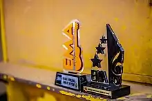 The trophy/plaque presented to winners of the various categories has been modified and changed over the years. Currently, the trophy is made of an acrylic glass guitar with EMA on a wooden handle.[5]