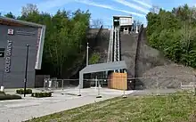 A kilometre-long funicular was part of the Garden Festival in 1992, but closed afterwards. In June 2015 a new inclined elevator, the Ebbw Vale Cableway, was opened.[24] The lift was built by ABS Transportbahnen (Doppelmayr Garaventa Group).[25] Its length is 57 metres (187 ft) and has a vertical lift is 24 metres (79 ft).[26][27] It has one car and operates from Monday to Friday, 7am to 7pm fully automatically, without attendants. The short, 20 second, journey is free to travel and it is intended to improve access between levels in the town, from 'The Works' site and Coleg Gwent, up to the town centre. The Works site is the site of the old steelworks and the current focus of much redevelopment for the area.
