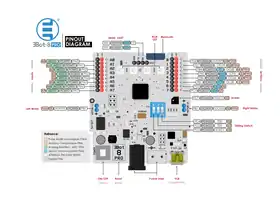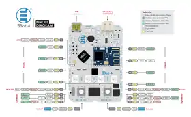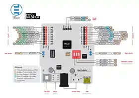 The diagram consists of two layers. The first layer has (ATMEGA1284P) pin functions, the second has the Arduino-compatible pins (bootloader), and the second layer has the names of the (Ebot) pins. The pin names and placement have been modified to suit the unit’s inputs and outputs ports, which will facilitate the programming process for the user.[1]