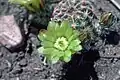 This cactus has a small spherical to ovoid, sometimes elongated or cylindrical in shape, stem 3 centimeters to over 30 centimeters tall and up to 1 to 9 centimeters wide. The 6 to 18 ribs are clearly humps. It is mostly unbranched but it may occur in squat clusters of several branches. The body of the plant is ridged and lined with many areoles bearing spines. The spines may be red, yellow, white, purplish, or bicolored, sometimes with darker tips and are up to 2.5 centimeters long. The 8 to 24 marginal spines are also red, cream or brown and up to 1.8 centimeters long. The flower is up to 3 centimeters long and has tepals in shades of yellowish, brownish, greenish, or occasionally red, with darker reddish midstripes. The tepals are thin at the tips. They are usually wide open, funnel-shaped and green to yellow-green. They are 2.5 to 3.0 centimeters long and large in diameter. The fruits are spherical, green and heavily thorny.[3][4]