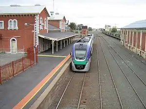 The brick station building at Echuca was provided with the opening of the line, along with a double-gabled brick goods shed, and a three-road locomotive depot. The station building was expanded in 1877, and a large water tower was erected in the same year (demolished in 1977).[5] An iron footbridge was added in 1880.[6] In June 1974, the former northern waiting room section of the station building was demolished.[7] The concrete rail bridge over the Murray River, to the north of the station, opened in February 1989, replacing a combined road and rail bridge that opened in 1878.[3]