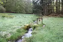 The Edelbach springs in a forest at the foot of the back of the mountain Eselshöhe, below the mountain Edelberg 477 metres (1,565 ft), between its two northern foothills, Sommerberg 466 metres (1,529 ft) and Ölberg 461 metres (1,512 ft). The springs are located in the 130 metres (430 ft) deep notched Ringgrund on the left mountain side. The main source is located on the boundary to the unincorporated area Gemarkung Schöllkrippener Forst, below the hiking trail K2. The drainage basin above ground is about 4 square kilometres (1.5 sq mi) and reaches up to the Spessart-Höhenstraße (a scenic route). The Ringgrund from there to the spring is a dry valley.