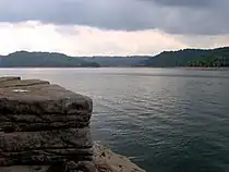 The park is situated amidst rolling hills ("knobs") that comprise part of the geological boundary between the Eastern Highland Rim and the Central Basin. These hills are typically underlain by Mississippian period limestone, the erosion of which has created karst-like formations throughout the Center Hill Basin.[1] Outcroppings of this limestone are visible along the cliffs overlooking the lake.