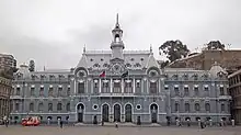 The Edificio de la Comandancia en Jefe de la Armada de Chile,[1] also known as Edificio de la Intendencia de Valparaíso, because it was a purpose-built Intendencia,[2] is a building designed in an eclectic style with Renaissance Revival architecture elements,[2] which rises 5 floors in height and covers 8,000 square metres (86,000 sq ft).[3] The main facade of the building faces the Plaza Sotomayor of Valparaíso and the Monument to the Heroes of Iquique.[4]