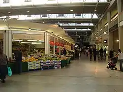 The airy South Mall leading north is sheltered by a translucent roof and lined with a mix of shops. Leading off is the library and offices on three floors which was converted from a former departmental store. In the library, memorial boards to local people, from the old Town Hall can be viewed. The Market Square is a covered area (originally open to the elements) lit by clerestory windows. The market stalls today are permanent fixtures. The big, bustling no-frills market is popular with shoppers with a good range of goods, particularly - greengrocery.