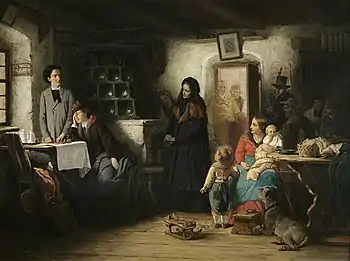 Friends came to his assistance, but it wasn't until 1867 that he achieved some success with his painting "The Storyteller". This helped him obtain a position in the studios of Karl von Piloty in Munich, where he worked for two years.[2] His associates there included Hans Makart and Franz Defregger. Afterwards, he continued to study independently and scored his first major success in 1870 with his genre painting Die ereilten Flüchtlinge (The Refugees, Overtaken), which was purchased for the gallery of the Schloss Belvedere.[1] This sale, the commissions that followed and the fees from several students enabled him to take a long-desired study trip to Rome and Naples.