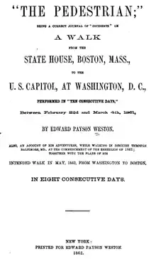 - Edward Payson Weston. The pedestrian: being a correct journal of "incidents" on a walk from the state house, Boston, Massachusetts, to the U.S. Capitol, at Washington, D.C., performed in "ten consecutive days", between February 22d and March 4, 1861. NY: E.P. Weston, 1862