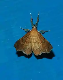 Its wingspan is 34 mm. Head, thorax, abdomen and wings are yellowish brown. Forewing with an acute apex. Thorax and abdomen has smooth scales. A hyaline (glass-like) spot is found in the cell and an irregular hyaline spot found on the discocellulars composed of conjoined spots. Hindwings with crenulate outer margin. A hyaline lunulate mark is found on a rufous patch at end of cell. Cilia whitish at apex and towards anal angle. Underside of the wings are suffused with grey.[4]