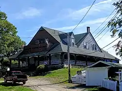 The Eighth Maine Memorial is located on the south coast of Peaks Island, a large island at the southeastern edge of Casco Bay east of downtown Portland. It is a large two-story rectangular structure, with a gabled roof whose sides are punctuated by large cross gables. The main roof extends down to the first floor, where it transitions into the roof of a porch that wraps around the entire structure. The walls are finished in a combination of clapboards, wooden and vinyl shingles, and asphalt shingles. The building rests on a fieldstone foundation that slopes down toward the shore, exposing part of the basement. At one corner an octagonal three-story tower rises. The building interior is organized with public spaces on the ground floor, kitchen and service facilities in the basement, and living quarters on the second floor.[2]