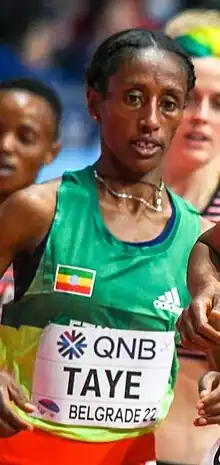 She won the bronze medal in the 3000 metres at the 2022 World Indoor Championships in Belgrade with a time of 8:42.23. Her compatriot Lemlem Hailu took gold in 8:41.82 while second-placed Elle Purrier St. Pierre clocked 8:42.04.[6] Taye ran 14:21 at the Cursa dels Nassos 5K on New Year's Eve trying to improve her own world record, the second-fastest mark in history.[7]