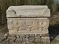 Meanwhile, between the first and fourth centuries CE, one of the largest known cemeteries of the region grew in El Buss with more than forty tomb complexes, at least 825 graves and the physical remains of almost 4,000 individuals.[15] The marble sarcophagi, which were imported from Greece and Asia Minor, and the other tombs of the monumental necropolis spread on both sides of the road leading to the triumphal arch over a kilometer in length.[16] It is unclear how far the burial grounds extended, but researchers argue that large parts of the modern camp could well have been part of the necropolis. Whereas the Phoenician funeral practices of an egalitarian ideology concealed social differences, the Roman graves did the opposite: