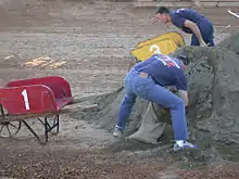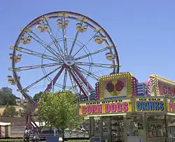 Started in 1859, the El Dorado County Fair includes four days of exhibitions,[2] contests, competitions, concerts, carnival rides, food, and more.[3] Attractions include the junior livestock auction, and exhibits,[4] featuring items such as photography, food, artwork, homemade wine, and homebrew, which are on display throughout the fair's four-day run. Friday night events in the grandstands usually consist of Mutton Bustin' and Humpz and Hornz bull riding. Other activities include cooking demonstrations, free children's workshops, and games for all ages hosted by Flo the Clown, such as: funnel cake eating contests, a bean spitting contest, and big wheels races. The annual John M. Studebaker Championship Wheelbarrow Races take place on Sunday evening in the grandstands.[5] The father and child look-a-like contest takes place on the main stage Sunday as part of the Father's Day activities. Previous El Dorado County Fair sponsors include Home Depot, Gold Country Ace Hardware & Hobbies, among others.