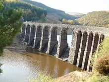 - The Garreg-ddu dam – although looking like a viaduct, it is actually a submerged dam. Its role is to maintain a sufficient level in the Garreg-ddu reservoir so water can enter the Foel Tower and the gravity-driven aqueduct to the Frankley Reservoir in Birmingham. The dam is only required to operate during times of extreme drought.