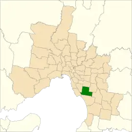 It largely covers the area of the abolished district of Clayton, covering south east suburbs in Melbourne. It includes all or parts of the suburbs of Clarinda, Clayton, Springvale, Heatherton, Mentone, Dingley Village and Cheltenham.[2]