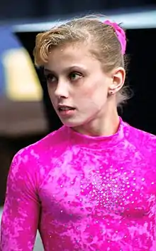 Elena Mikhailovna Zamolodchikova (Russian: Елена Михайловна Замолодчикова; born 19 September 1982)[3] is a Russian former artistic gymnast and four-time Olympic medallist. She is the 2000 Olympic champion on vault and floor exercise, and she is a two-time World champion on vault (1999, 2002). In 2015, she was inducted in the International Gymnastics Hall of Fame.[2]