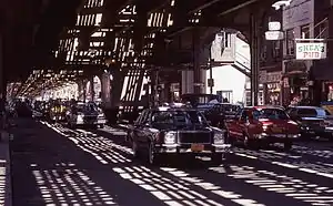 Traffic on Roosevelt Avenue in Jackson Heights, New York City, under the elevated IRT Flushing Line (used by the 7 and <7> trains) in the 1980s
