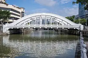 In 1844, a wooden footbridge built by John Turnbull Thomson replaced the older bridge, and was named Thomson's Bridge.[1] This was demolished in 1862; in its place an iron bridge was built and named Elgin Bridge after James Bruce, 8th Earl of Elgin, Governor General of India. It was widened in the 1870s. In 1925 the iron bridge had to make way for a new concrete bridge, which was opened to traffic by the Governor of the Straits Settlements Sir Hugh Clifford on 30 May 1929.[4]