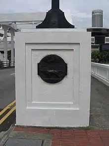 The crest of the Singapore Municipal Commission at one end of Elgin Bridge, Singapore.