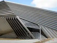 The angular facade is composed of pleated stainless steel and glass and was conceived to give the building "an ever-changing appearance that arouses curiosity yet never quite reveals its content." (Zaha Hadid Architects).[23]