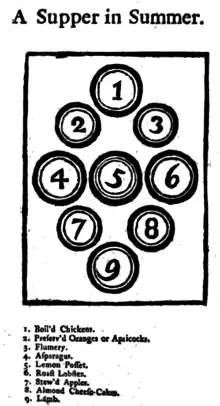 Her book was presented as practical help for "Mistresses of Families, higher and lower Women servants" based on Moxon's thirty years of "practice and experience". Along with the numerous recipes for "soops, made-dishes, pastes, pickles, cakes, creams, jellies, made-wines, &c" she offered month-by-month menu plans for lunch, supper etc. with diagrams and instructions on how to set out a variety of dishes on the table, in the style of the 18th century.