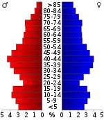 The county population contained 24.00% under the age of 18, 6.80% from 18 to 24, 28.60% from 25 to 44, 23.30% from 45 to 64, and 17.30% who were 65 years of age or older. The median age was 39 years. For every 100 females there were 98.00 males. For every 100 females aged 18 and over, there were 95.30 males.