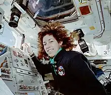 Ochoa became the first Hispanic woman to go to space[14][15] when she served on a nine-day mission aboard the Space Shuttle Discovery in 1993. The purpose of the Shuttle mission was to study the Earth's ozone layer. A veteran of four space flights, Ochoa has logged nearly 1000 hours in space.[16] She was a mission specialist on STS-56 (1993), was payload commander on STS-66, and was mission specialist and flight engineer on STS-96 and STS-110 in 2002.[1][17] Ochoa was in Mission Control during the Space Shuttle Columbia disaster and was one of the first personnel informed of television coverage showing Columbia's disintegration.[18]