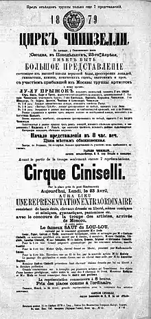 In the summer of 1879, the Madigan family tried to run their own small circus company in Finland and at the same time Hedvig began using the name Elvira Madigan.[6] The following year, when the family appeared in Circus Cremes in Vienna, Gisela Brož became a foster child in the family, she was two years older than Elvira. Gisela was trained as a tightrope dancer, and together with Elvira on slack line they practiced a unique number, where they appeared simultaneously on separate lines, one above the other. Elvira used to juggle at the same time as she was on the line. The number became a sensation, and in the following years the girls appeared as "daughters of the air" in circuses and in variety rooms across much of Europe, including in Berlin, Paris, London, Brussels and Moscow.[7] After an appearance at Tivoli in Copenhagen in 1886 before the Danish royal family, the girls were each awarded a gold cross by King Christian IX of Denmark.[8] The following year, John Madigan again started his own circus company, this time in Denmark. Gisela left the family in the autumn of the same year, after which Elvira had to appear alone when the tour continued to Sweden.