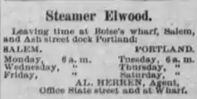 Advertisement for steamer Elwood, placed April 5, 1894 in Capital Journal, Salem, Oregon.[14]