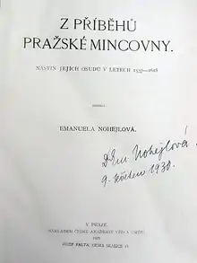 In 1949 she was appointed as a lecturer at Masaryk University in Brno, alongside her museum work.[1] She worked extensively on hoarding practices in Bohemia, Moravia and Silesia, examining deposits from the ancient period up to the nineteenth century,[3] In her research she worked across many periods, with her specialisms lying particularly in Czech coinage, especially of Bohemia,[4] and metrology.[5] She was also considered an expert on medieval counterfeits.[6] In Nohejlová-Prátová's work on Czech coinage in the tenth and eleventh century, she believed that numismatics tended to over-estimate the link between iconography and contemporary politics.[7] In 1958 she was awarded a doctorate.[1] In 1964 was appointed Professor at the Charles University.[1] By 1960, she was Keeper of Numismatics and President of the Czech Numismatic Commission.[8]