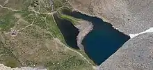 The lake is northeast of the summit of Mount Timpanogos, at the base of the almost vertical northeast face of the mountain, with an elevation of 10,397 feet (3,169 m).[1][3] The now mostly vanished and completely buried Timpanogos Glacier left behind a terminal moraine which now impounds the lake. The runoff from the rock glacier feeds the lake and colors it blue.[4] The lake is accessible by hiking, the Mount Timpanogos Trail (also known as the Aspen Grove Trail) from Aspen Grove being the fastest way to reach it. The lake is 6.9 miles (11.1 km) from the trailhead,[5] or about two-thirds of the way up to the summit.