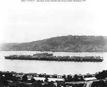 Incomplete merchant ships laid up at Seattle, Washington, circa early to mid-1919, probably the storage facility at Seattle used by the Northern Pacific Division of the Emergency Fleet Corporation for wooden cargo ships it accepted without engines after the World War I Armistice. Naval History & Heritage Command, Online Library of Selected Images, Photo #: NH 43179.