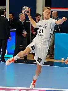Emil Frend Öfors playing for THW Kiel against Paris Saint-Germain HB in March 2018