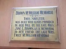 In 1908, Jane Brown bequeathed two hundred pounds as well as the residue of her estate "for the benefit of the cottage hospital at Otaki and to be applied by the trustees of the institution in such manner that it may be a lasting memento of my dear friend Mrs Emily McWilliam and her work in connection with the institution".[12][13] A plaque was erected on a shelter at the Otaki Sanitorium memorialising McWilliam from funds left by Jane Brown.[14]