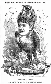 Caricature from Punch, 17 September 1881: "MADAME ALBANI. A Thing of Beauty is a Gye for ever!"