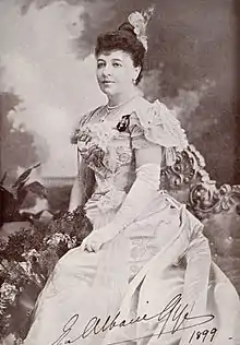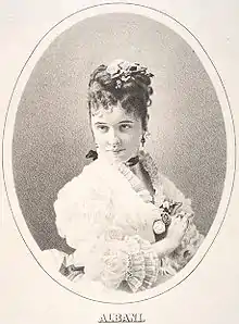 In her third season in London, she performed in mostly the same roles she had in her first two seasons: La sonnambula, Lucia di Lammermoor, Linda di Chamounix and Martha.[8] The competition in the opera world of London was very stiff, and it was common for performers to be possessive of their roles.[17] After her third season, Queen Victoria requested a private performance from Albani, who travelled to Windsor Castle in July 1874 to perform the aria "Caro nome" from Rigoletto, the folk ballad "Robin Adair", the Bach/Gounod "Ave Maria", and the popular song "Home! Sweet Home!". The Queen was suitably impressed by her performance and would call Albani back to perform other pieces, by composers such as Brahms, Grieg, Handel and Mendelssohn, as well as traditional French and Scottish tunes.[22][23]
