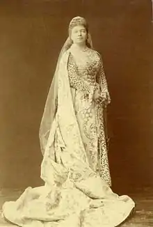 Albani married Ernest Gye on 6 August 1878. She became pregnant, but continued to tour and perform until shortly before the birth of her son, Frederick Ernest Gye on 4 June 1879.[28] He was to be the couple's only child. In the fall of 1879, after singing at the Hereford and Bristol Festivals, she returned to Florence.[29] In January 1880, she sang in Nice, and from there she went to the Théâtre de la Monnaie in Brussels.[30] On 26 June 1880 she performed Isabella in Ferdinand Hérold's Le pré aux clercs at Covent Garden, a production that was mounted especially for her.[31]