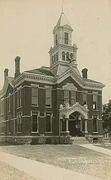 On October 20, 1879, the county seat was moved to Swan Lake in the center of the county, but because of litigation over the move, a courthouse was never built there. There was also little in the way of settlement in this part of the county.[1] Before the issue could be resolved in the courts, the county seat was moved back to Estherville after a vote in 1882. In 1884 a two-story, brick, Italiante courthouse was built for $11,718.[3] It featured bracketed eaves, a decorative porch surrounding the main entrance, and a bell tower. A roof fire on April 2, 1918, did little damage to the structure.[1]
