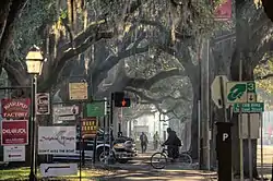 ![]() A 2016 view of the row of live oak trees between the park and East Bay Street, looking east from the Rossiter Place exit onto East Bay Street | |
