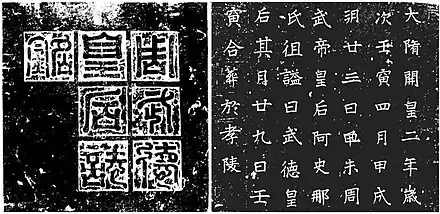 - ↑ Original text of the epitaph: “大隋开皇二年岁次壬寅四月甲戌朔二十三日甲未周武帝皇后阿史那氏祖谥曰武德皇后其月二十九日壬寅合葬于孝陵”