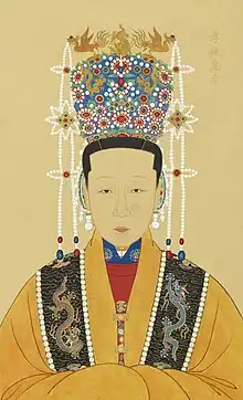 As the Chongzhen Emperor had been only five years old at the time of her death, he requested that someone obtain a portrait of his mother for him. Consort Yi (Chinese: 傅懿妃) had been a concubine of the Taichang Emperor along with Lady Liu when he was crown prince and had lived in a palace close to her. Consort Yi found a palace attendant who looked similar to Lady Liu and ordered her mother, Esteemed Lady Xu of the State of Ying (灜國太夫人徐氏), to oversee the project.[1] On its completion, the portrait was brought through Zhengyang Gate (Chinese: 正陽門). The emperor knelt to greet the portrait and it was hung in the palace. Old servants were summoned and asked if the portrait resembled Lady Liu, after which the emperor and all in attendance wept.[1]