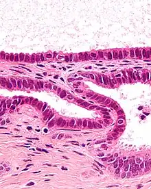 Endosalpingiosis is a condition in which fallopian tube-like epithelium is found outside the fallopian tube. It is unknown what causes this condition. It is generally accepted that the condition develops from transformation of coelomic tissue.[1] It is often an incidental finding and is not usually associated with any pathology.