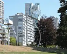 Engagement, installed at Sunset Beach in 2005, depicts two diamond engagement rings and stands nearly 30 feet tall. The diamonds, illuminated and tilting away from one another, are composed of translucent plexiglass boxes, steel and aluminum.[1] The Vancouver Biennale described the sculpture as pop art. Engagement is one of several sculptures by Oppenheim that has been installed in Vancouver: The Device to Root Out Evil an upside-down aluminum church, was installed along the waterfront in Coal Harbour from 2005 to 2008, and Arriving Home was displayed within Vancouver International Airport as part of the 2009–2011 Vancouver Biennale.[8]