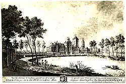 Thanks to engravings made by Romeyn de Hooghe around 1680, we can have a view how the gardens were at that time.[2] There were fountains, pavilions, triumphal arches, statues, mountains, an orangery, a theatre, artificial caves and other follies. In the centre of the gardens a seven-sides pavilion was constructed, which served both as a temple of Hercules and an observatory. The viewing terrace was reached by a movable windlass staircase. The basin around the pavilion contained water that, according to the principle of communicating vessels, provided the necessary water pressure for the fountains and other hydraulic elements in the park. Seven large and seven small allees departed from the pavilion, each with its own tree species and landscape. The small avenues always led to a "bulwark" where a god statue stood. The whole was imbued with cosmological significance.