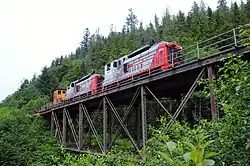 ![]() Two EMD SW1200s lead a train south over the Kokish River. | |