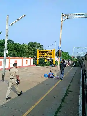 Ennore railway station is one of the railway stations of the Chennai Central–Gummidipoondi section of the Chennai Suburban Railway Network. It serves the neighbourhood of Ennore, a suburb of Chennai, and is located 16 kilometres north of Chennai Central railway station. It has an elevation of 7 metres above sea level.