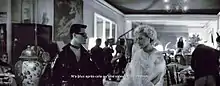 The series Art Brothel consists of 25 photographs of various sizes with plastic laminate backings. The artist’s intention was to create an ironic, desecrating celebration of the system of contemporary art with an "overtone of parody"[61] and using references to cinema. Corte created the Art Brothel series in 1995, the year of the Venice Biennale centenary, so it is not surprising that this celebration is his first ironic reference. On the backstage of an actual film set, where Corte worked as a scenographer and actor, a group of professional male, female and transgender high-class prostitutes plays in sequences that allude to well-known paintings, techniques or artistic trends chronicling the history of art. The artist himself also appears in these sequences. To create the photographic series, Corte projected the sequences on a cinema screen, and then re-photographed them. The resulting photos were later printed and cropped by the artist, sometimes leaving at their edges a small portion of the screen on which the sequences were projected. Also, French subtitles, apparently disconnected from the various scenes, have been superimposed on the photographs. The titles of the single photos are indicative of the artist’s intent, but the series contains more subtle references to cinematographic art. For example, the film set is located in a showroom on Via Veneto – the famous street in Rome that was featured in the 1960 film by Federico Fellini La Dolce Vita, and the show room itself belongs to an Italian architect and interior designer of villas owned by Sylvester Stallone.[62]