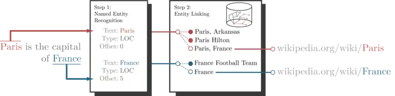 In natural language processing, entity linking, also referred to as named-entity linking (NEL),[1] named-entity disambiguation (NED), named-entity recognition and disambiguation (NERD) or named-entity normalization (NEN)[2] is the task of assigning a unique identity to entities (such as famous individuals, locations, or companies) mentioned in text. For example, given the sentence "Paris is the capital of France", the idea is to determine that "Paris" refers to the city of Paris and not to Paris Hilton or any other entity that could be referred to as "Paris". Entity linking is different from named-entity recognition (NER) in that NER identifies the occurrence of a named entity in text but it does not identify which specific entity it is (see Differences from other techniques).