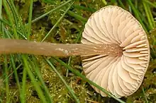 The cap is broadly conical to convex, light amber-brown, ribbed, and grows up to 3 cm in diameter. It is ribbed almost to the centre. The gills are salmon pink and sinuate. The spores are pink. The stem is light brown, longitudinally fibrous and slender.